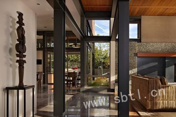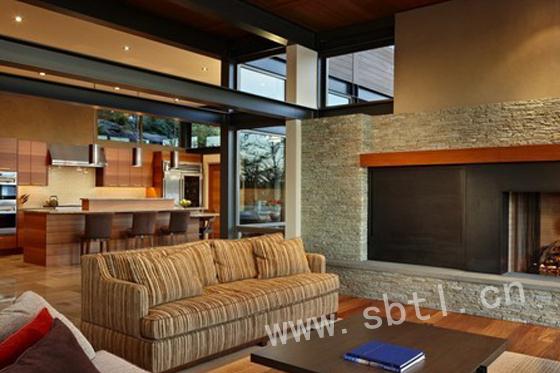 位于西雅圖的McClellan Architects設(shè)計(jì)了這棟位于湖畔的時(shí)髦住宅。其特點(diǎn)是擁有一部電梯、一個(gè)綠色屋頂、LED照明以及迷人的海濱景色。房屋坐落在一個(gè)陡峭的濱水地段。一部使用斯卡普島風(fēng)格裝飾的黑色鋼結(jié)構(gòu)樓梯、威尼斯石膏裝飾墻(文化石涂料)、明亮的LED燈具,看起來就像一片金色的樹葉。電梯位于房屋后部,可以直達(dá)父母的臥室和客廳,站在綠色的屋頂上便可以欣賞到湖畔的美景。