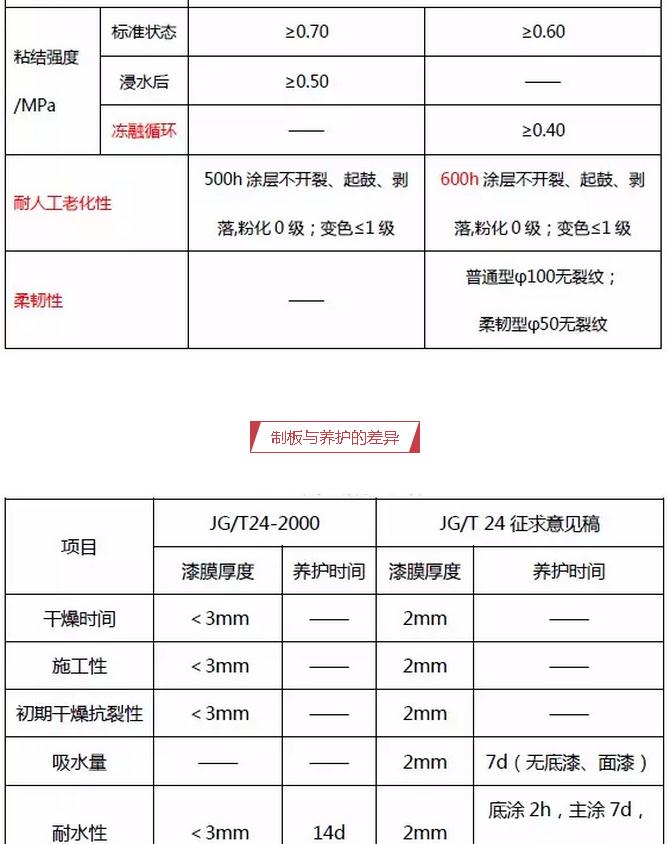 2、修改了試樣制備方法、樣品厚度、初期干燥抗裂性的試驗(yàn)時(shí)間、耐人工老化性時(shí)間,標(biāo)準(zhǔn)狀態(tài)粘結(jié)強(qiáng)度技術(shù)指標(biāo);