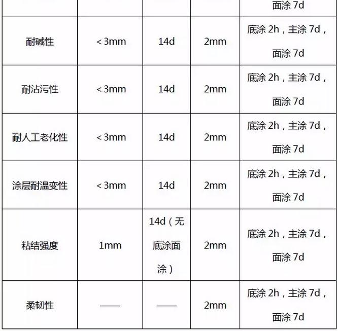 5、增加主涂吸水量、涂層體系柔韌性、凍融循環(huán)粘結(jié)強(qiáng)度項(xiàng)目;